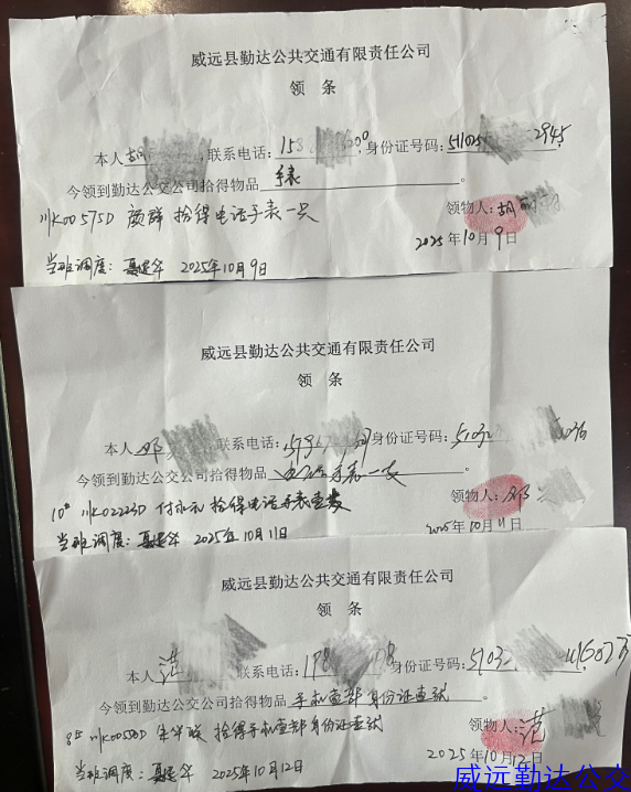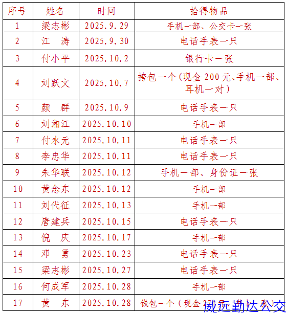 年10月勤达公交公司涌现出好人好事17起:现金474元、手机8部、电话手表7只、挎包1个、耳机1对、公交卡1张、身份证1张、书卡1张,失主凭有效证件已将失物领取。