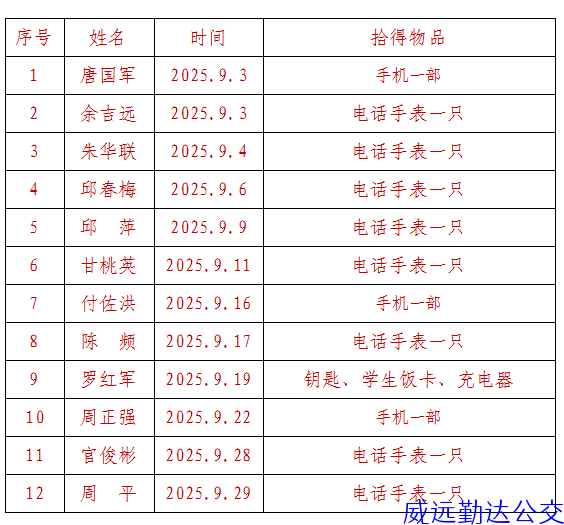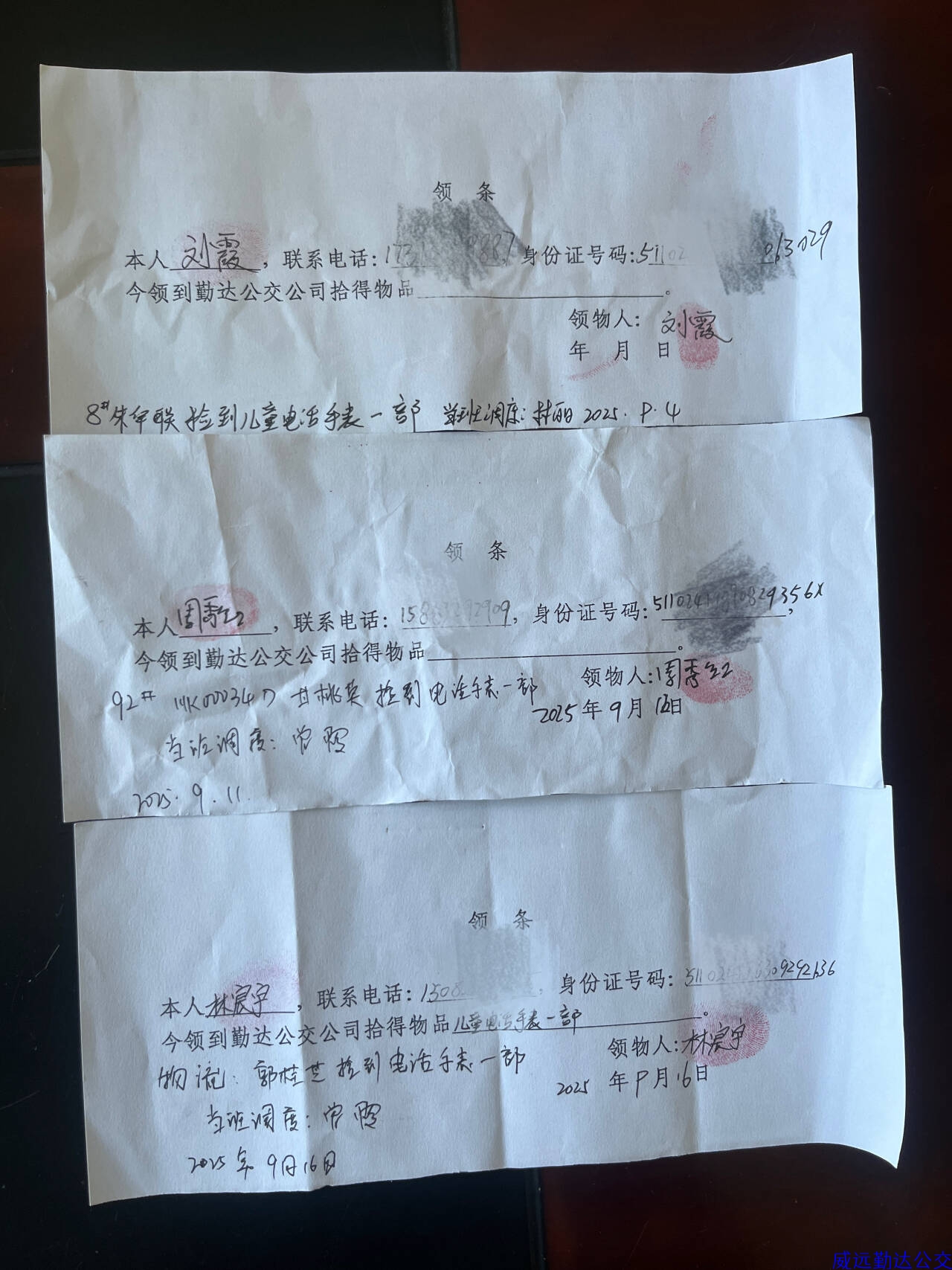 2025年9月勤达公交公司涌现出好人好事12起:手机3部、电话手表8只、钥匙1串、学生饭卡1张、充电器1个,失主凭有效证件已将失物领取。
