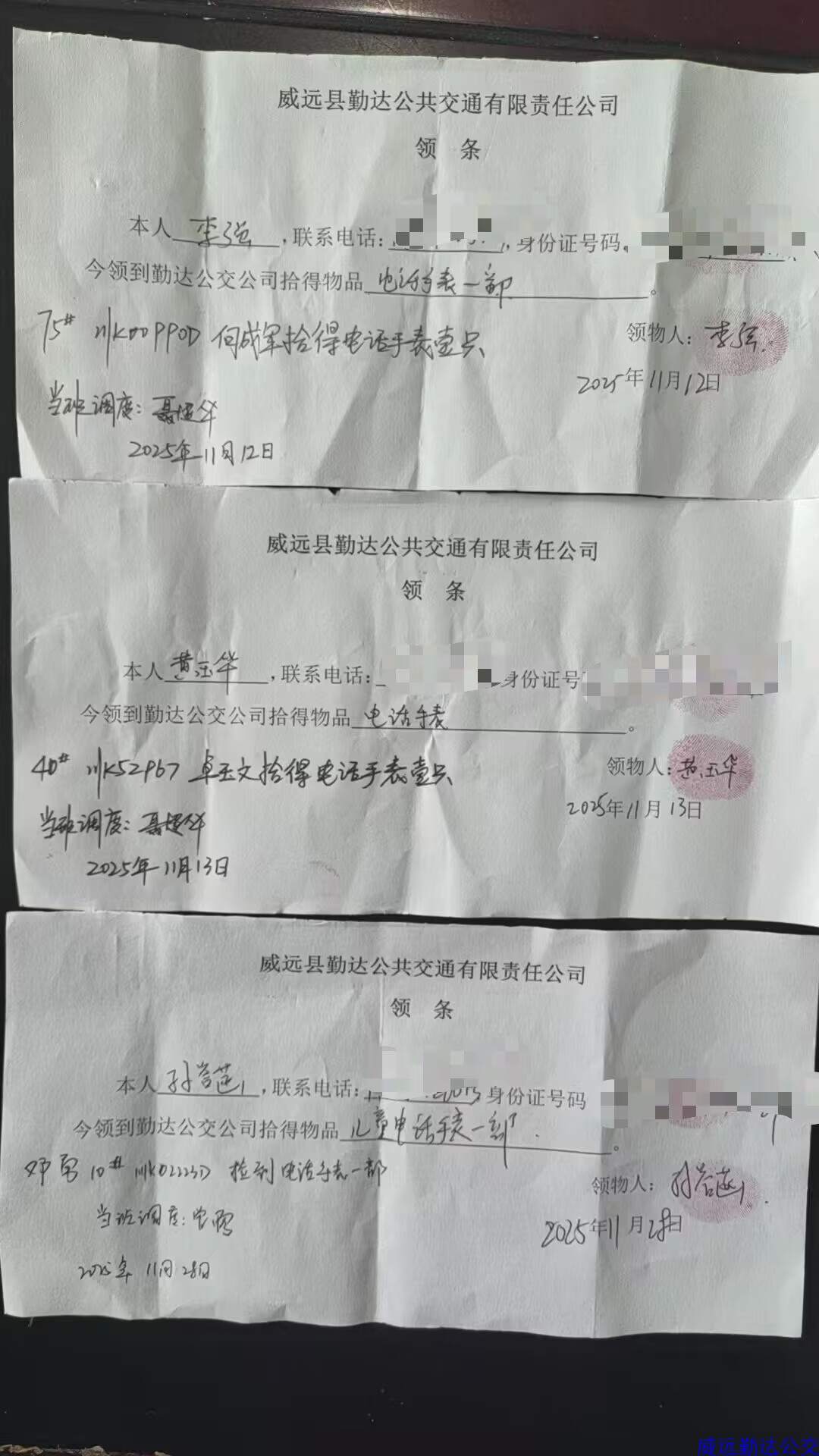 2025年11月勤达公交公司涌现出好人好事9起:手机1部、电话手表7只、背包1个、笔记本电脑1台、硬盘1个、眼镜1副,失主凭有效证件已将失物领取。
