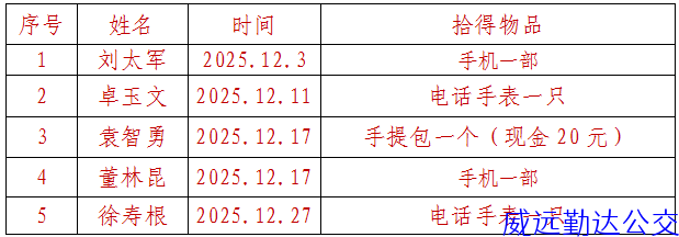 2025年12月勤达公交公司涌现出好人好事5起:现金20元,手机2部、电话手表2只、手提包1个,失主凭有效证件已将失物领取。