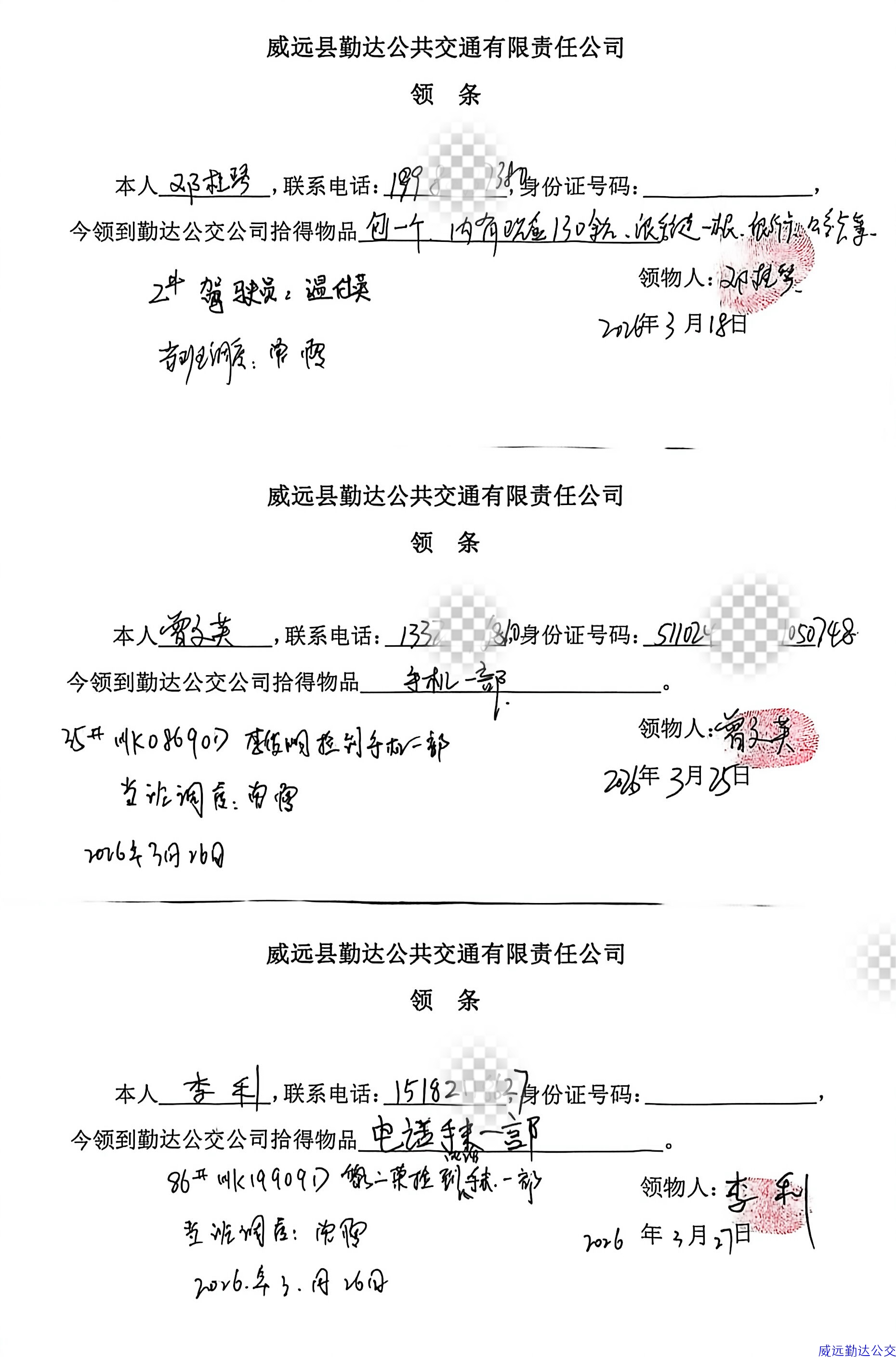 2026年3月勤达公交公司涌现出好人好事12起:现金1442.6元,手机2部、电话手表7只、手表1只,失主凭有效证件已将失物领取。
